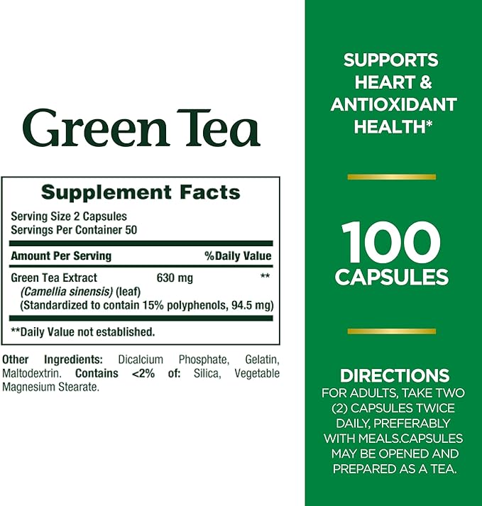 Standardized green tea extract delivering 630 mg per serving (2 capsules), 15% polyphenols (94.5 mg), and naturally occurring caffeine for everyday antioxidant and heart support. Capsules can be opened and prepared as tea. Non-GMO; free of artificial colors/flavors/sweeteners and common allergens.